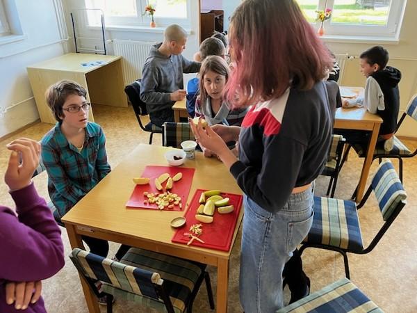 Ve čtvrtek 4. května se na naší ZŠ konala další část vzdělávacího programu Zdravá 5, aktivita zaměřena na zdravý životní styl. V první části se žáci zábavnou a interaktivní formou seznámili se zdravým stravováním, zopakovali si, proč jíst ovoce a zeleninu. V praktické části si žáci připravili zdravou svačinku. Paní lektorka nás rozdělila do tří skupin a každé dala k nastudování zdravý recept. První skupina připravila všem tortillové šneky plněné žervé, polníčkem, sýrem a šunkou. Druhá skupina připravila ovesnou kaši s tvarohem a medem, zdobenou jablky, banány a jahodami. Třetí skupina se postarala o lahůdku v podobě ovocného smoothie z banánu, jahod, medu, kefíru. Nakonec všechny čekalo to nejlepší – ochutnávka připravených jídel. Žáci se naučili připravovat zdravé pokrmy, pracovat s kuchyňskými pomůckami a vzájemně mezi sebou spolupracovat. Výsledkem byly zdravé mňamky. Děkujeme paní lektorce, L. Kertisové, je skvělá.